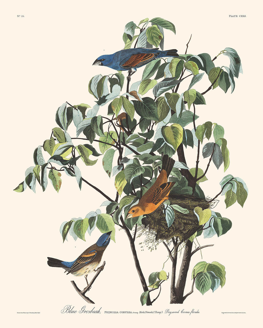 John James Audubon fue un naturalista y pintor prolífico, conocido por sus representaciones detalladas y realistas de los pájaros americanos. Su obra, Birds of America, es celebrada por sus ilustraciones a tamaño real y su meticulosa atención al detalle. La ilustración del Grosbeak Azul es notable por sus colores vibrantes y su intrincado fondo, que representa al pájaro en su hábitat natural con una claridad impresionante.