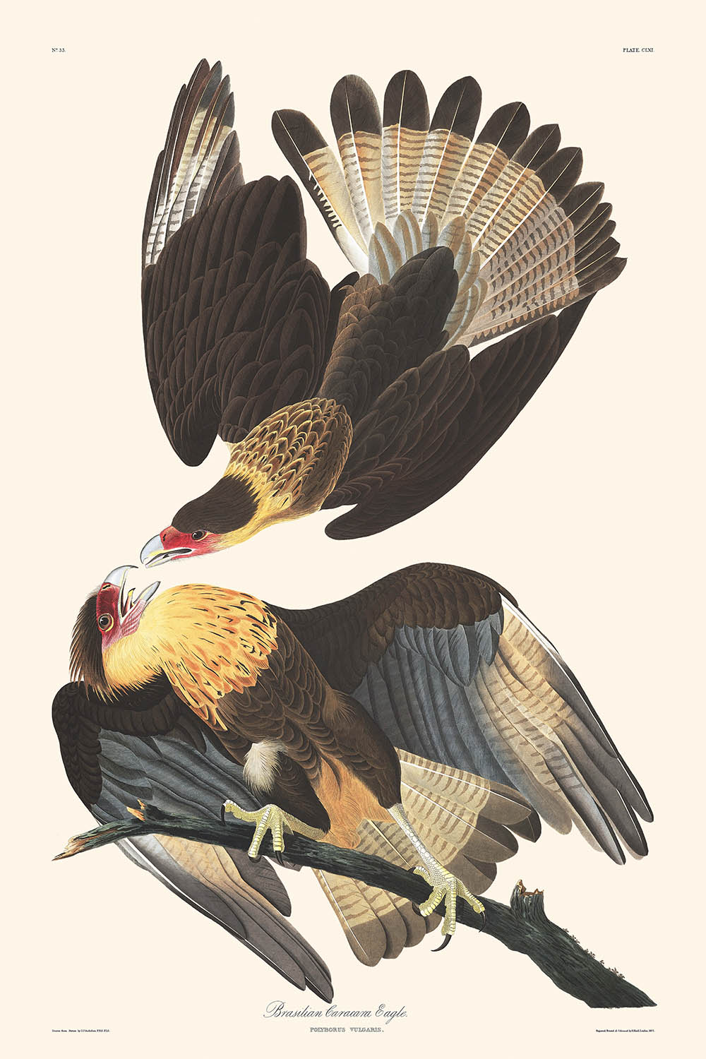 Presentamos la impresionante "Águila caracara brasileña" (Lámina 161), creada por el reconocido John James Audubon y publicada por primera vez en 1827 como parte de su ilustre serie "Las aves de América". Esta meticulosa ilustración captura la magnífica águila caracara con gran detalle, lo que refleja la exquisita atención de Audubon a las complejidades del mundo natural.