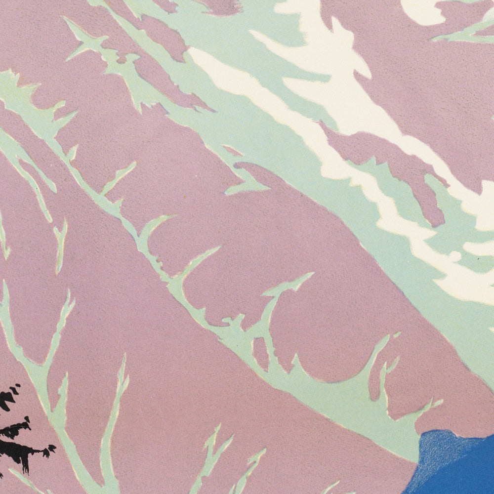 Design and color: The palette leans into cool blue and green tones for water and timberline, contrasted with warm pinks and peaches that wash the mountains in dawn light. The composition uses strong diagonals and layered silhouettes to create depth, with stylized clouds and a clear horizon guiding the eye toward the central peaks. Period typography anchors the image with confident simplicity. It’s a timeless aesthetic—equal parts romance and restraint—that suits both contemporary interiors and vintage-inspired spaces, adding a splash of alpine color and a sense of adventure to any wall.