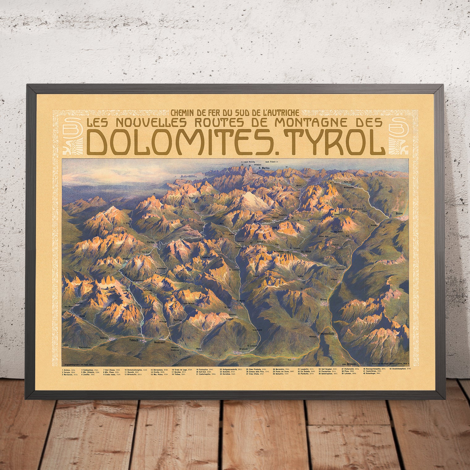 Chemin de fer du Sud de l’Autriche. Les Nouvelles routes de montagne des Dolomites. Tyrol by Gustav Jahn, 1907, is a jewel of the golden age of Alpine tourism. Created for the Austrian Southern Railway, this French‑language travel poster presents a sweeping bird’s‑eye panorama of the Dolomites at the dawn of motor touring. Jahn renders the Tyrolean limestone towers in sunlit saffron and deep blue‑violet shadow, with new roads snaking through green valleys and an elegant Art Nouveau border and title cartouche framing the scene. Look closely and you’ll spot place‑names picked out in crisp black lettering—Bozen, St. Ulrich, Corvara, Canazei, Campitello, and the famed passes of Pordoi, Sella and Grödner—inviting the viewer into the landscape.