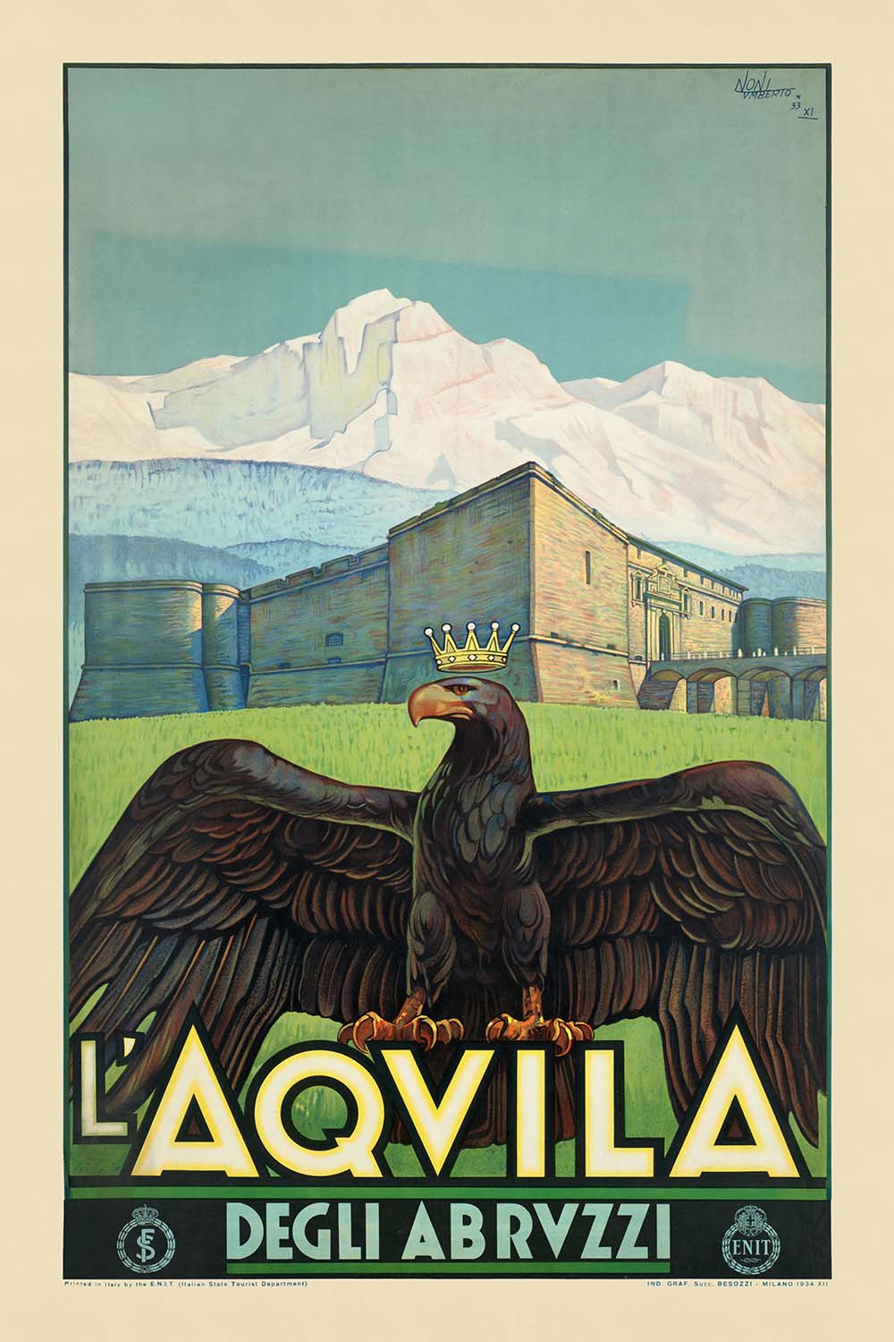 L’Aquila. Degli Abruzzi by Noni Umberto (1934) is a quintessential Italian Art Deco travel poster that celebrates the city of L’Aquila and its mountainous Abruzzo setting. Composed at a time when Italy championed cultural pride and domestic tourism, the image fuses heraldic symbolism with crisp, modern design. A crowned eagle—emblematic of power and guardianship—anchors the composition, set against an imposing fortress and a serene blue sky that evokes the cool air of the Apennines. The palette—dominated by rich greens and earthy browns with touches of blue and gold—conveys both the region’s natural character and a refined, contemporary elegance.