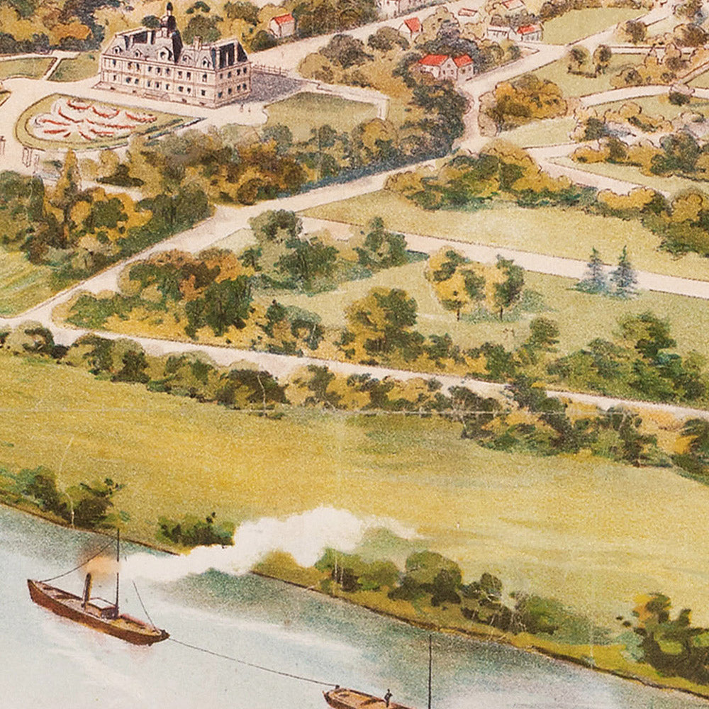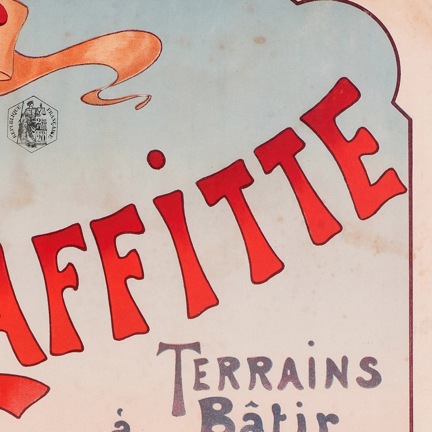 The subject is steeped in history. Maisons-Laffitte grew around the famed château designed in the 17th century, later evolving into a prized garden suburb as the parkland was carefully parceled into villa lots. By 1904 the town had become synonymous with gracious living—tree-lined avenues, fresh river air, and rapid rail links to Paris. This poster crystallizes that moment, marketing “terrains à bâtir” (building plots) with a combination of romance and rational planning that defined the era’s urban ideals.