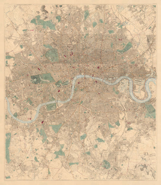 Originalmente impreso en 24 hojas, este es el mapa antiguo de Londres más detallado que puedes encontrar. Casi cada vivienda en Londres está dibujada en este mapa - y considerando que había alrededor de 3 millones de personas viviendo en Londres en la década de 1860, eso es un montón de viviendas.