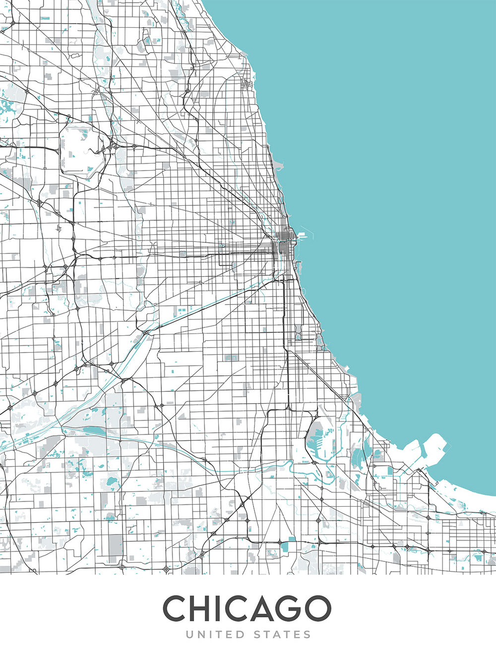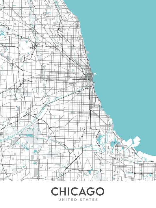 Este mapa de Chicago es un mapa moderno y detallado de las calles sin etiquetas, centrado en la ciudad de Chicago y sus áreas circundantes en Illinois. El mapa cubre una área sustancial, proporcionando una vista extensa de la ciudad y sus diversos vecindarios, pueblos y monumentos. El área geográfica rectangular capturada por el mapa ofrece una exploración completa del paisaje urbano de Chicago, convirtiéndolo en una pieza ideal para aquellos interesados en la geografía y la planificación urbana de la ciudad.