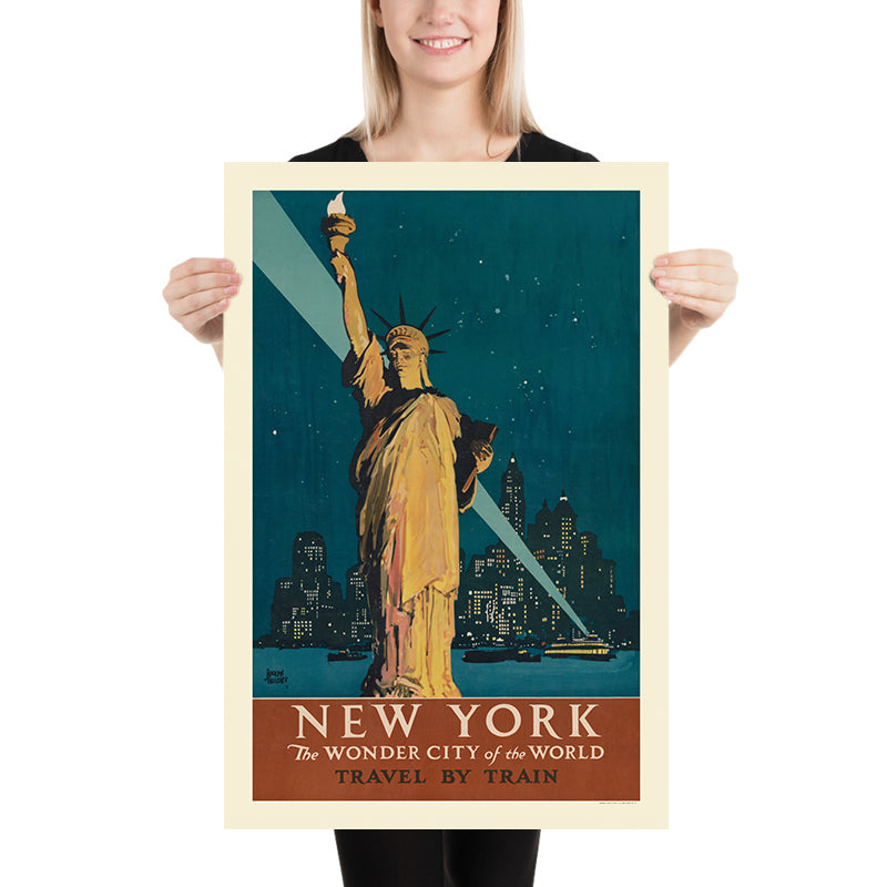 Introducing New York, the wonder city of the world Travel by train by Adolph Treidler, first published in 1927. This striking Art Deco travel poster captures the energy and optimism of Jazz Age New York, presenting the Statue of Liberty as a radiant beacon before a stylized skyline. With its streamlined geometry, star-dusted sky, and dramatic torchlight, the composition distills the thrill of arrival and the promise of modern urban life—exactly the message railroads wanted to share with would‑be travelers to America’s most dazzling metropolis.
