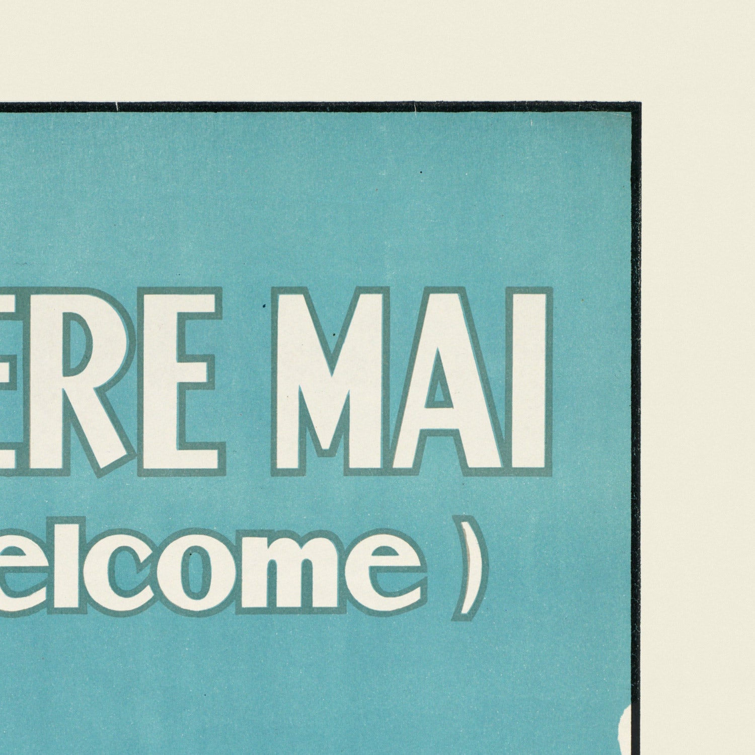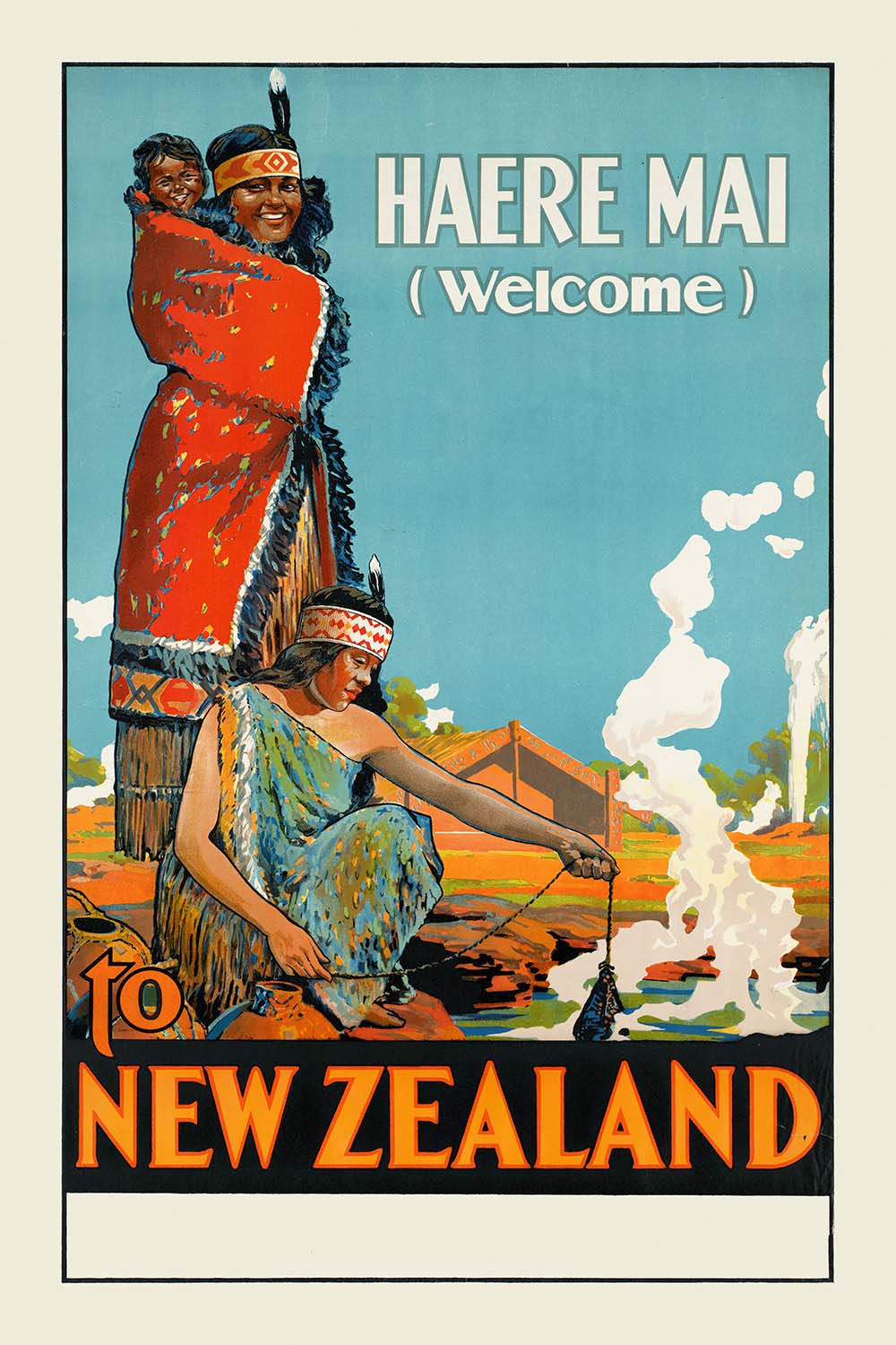 Haere mai to New Zealand is a luminous vintage travel poster celebrating Aotearoa’s spirit of welcome—“haere mai” being the Māori greeting that invites you in. The artist is unknown, as is common with studio-designed tourism art from the early to mid-20th century, but the intention is unmistakable: entice the traveler with bold color, confident typography, and a respectful nod to Māori culture. Turquoise blues, sunlit oranges, and punchy reds create a radiant invitation that feels both adventurous and warm.