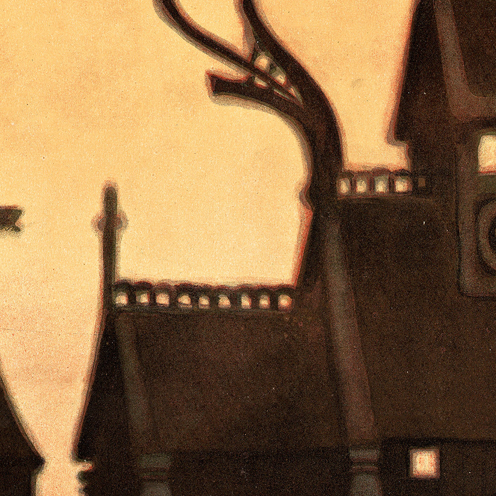 Rendered in earthy browns and deep forest greens, with sunlit yellow accents, the design exemplifies Art Nouveau’s flowing lines and organic forms. The decorative border and intricate roof patterns echo carved timber and textile motifs, while the asymmetrical layout and softly modulated tones create a warm, nostalgic invitation. It’s a piece that brings character and calm to a room—equally at home in a Scandi-inspired interior, a study with vintage travel accents, or a living room that calls for a statement of history and style. Beyond its beauty, it’s a conversation starter for anyone who has chased the midnight sun above the Arctic Circle or dreams of doing so.