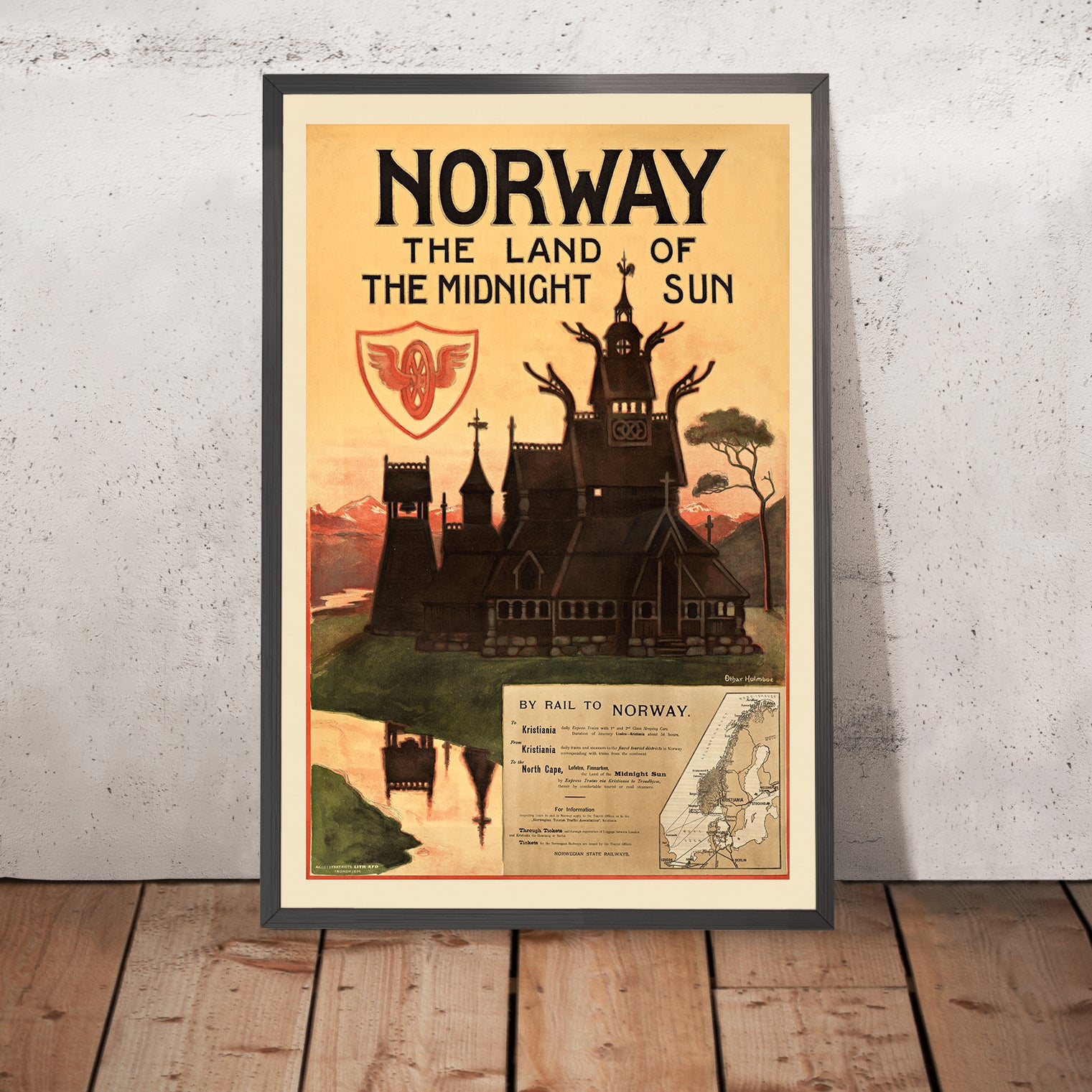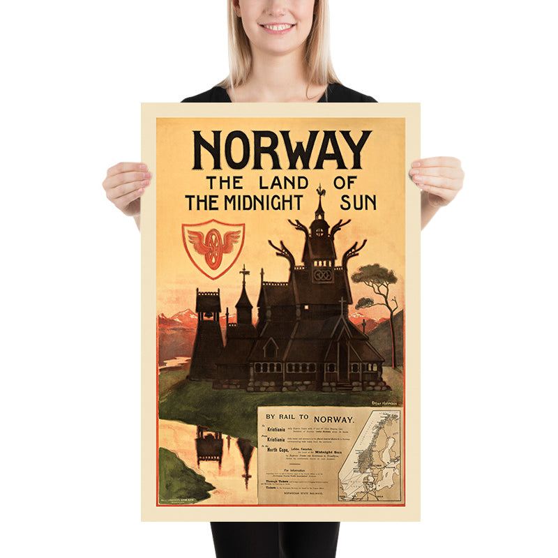 Norway – the Land of the Midnight Sun by Othar Holmboe (1905) is a luminous Art Nouveau travel poster that invites the viewer north to a realm of long summer light, carved timber churches and mountain-green landscapes. Created at the dawn of modern tourism—and the very year Norway affirmed its independence—this design blends national heritage with the promise of comfortable, contemporary travel. Holmboe’s poster captures the romance of rail journeys to a land where the sun lingers above the horizon, making Norway feel both timeless and thrillingly new.
