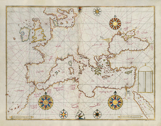 Si estás buscando algo ligeramente diferente, otra opción sería este increíble mapa de un Mapa Mundial en lengua árabe por Piri Reis en 1525.