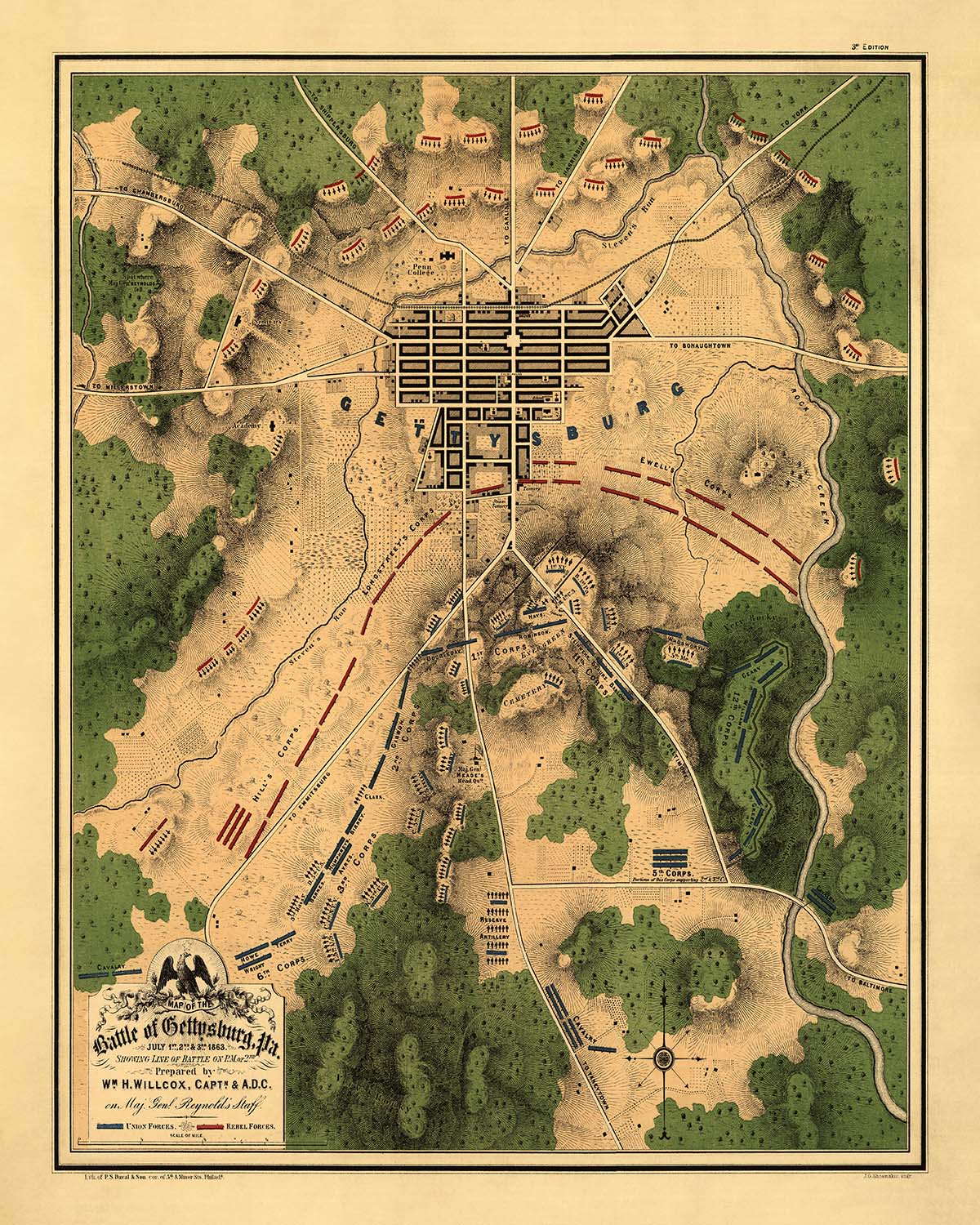 • Regions depicted: Gettysburg, Pennsylvania, particularly focusing on the battlefield area and surrounding structures.