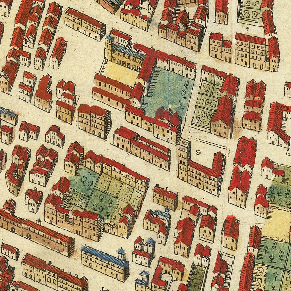- Design and Style: Detailed urban layout with a focus on symmetry and color, emphasizing the city's fortifications and street layout.
