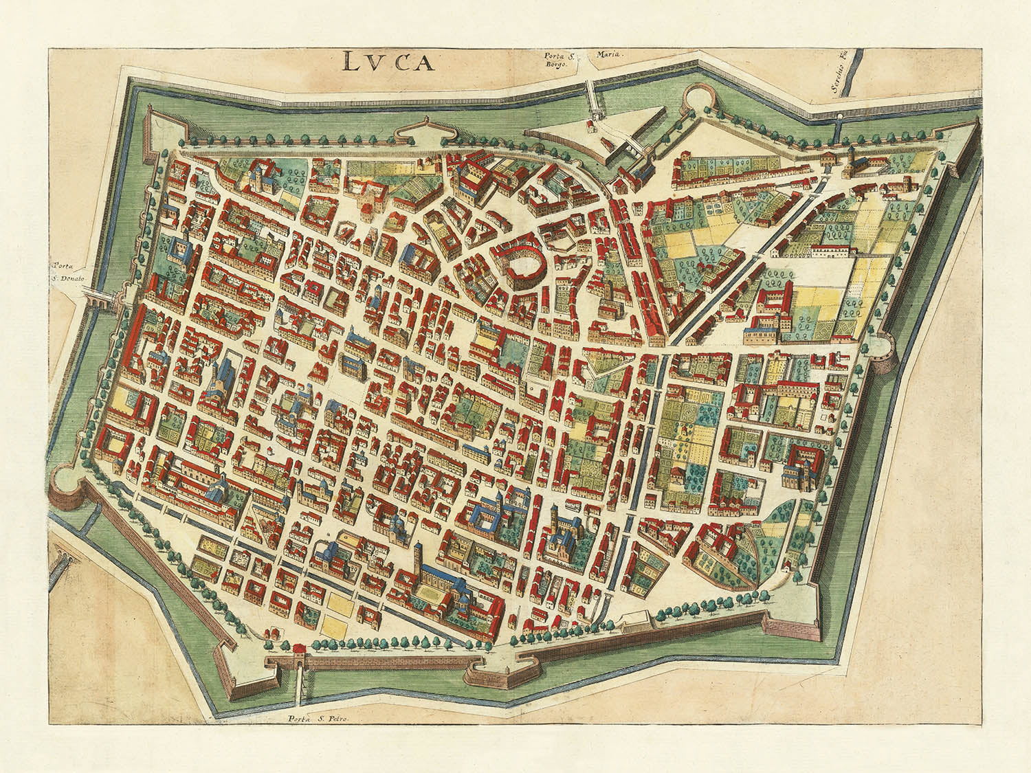 Old City Map of Lucca, Tuscany by Merian, 1638: Walls & Moat; Piazza Anfiteatro; Cathedral; Palazzo Pfanner; Via Larga