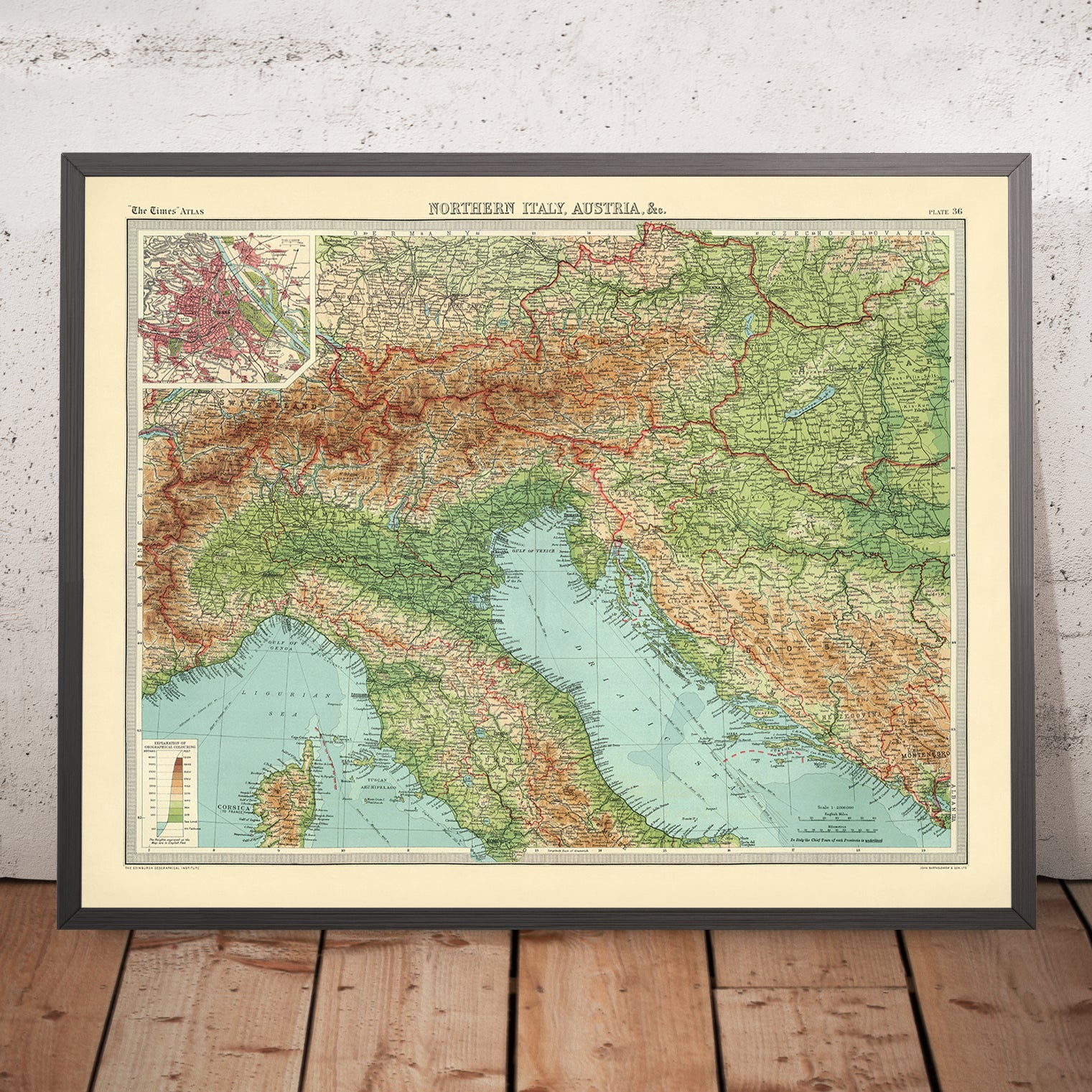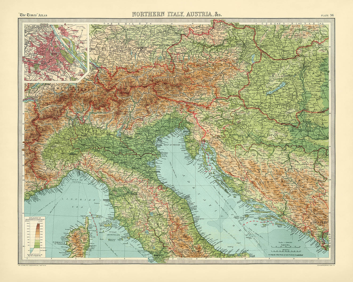 Northern Italy, Austria, &c. is a quintessential Bartholomew production, created in 1922 for The Times atlas by the Edinburgh Geographical Institute and John Bartholomew & Son, Ltd. Issued as part of the second issue of the 1920 edition—the moment when The Times transitioned from Andree’s late nineteenth-century plates to Bartholomew’s modern, color-forward style—it embodies the firm’s commitment to intellectual rigor and visual refinement. The map’s political clarity is matched by its physical eloquence: hypsometric tints articulate the Alps and adjoining highlands with graded color, while bathymetric tints deepen the Adriatic and alpine lakes with cool tonal steps. A careful legend and precise scales complete a composition that is both a work of geographical scholarship and a poised artifact of interwar cartography.