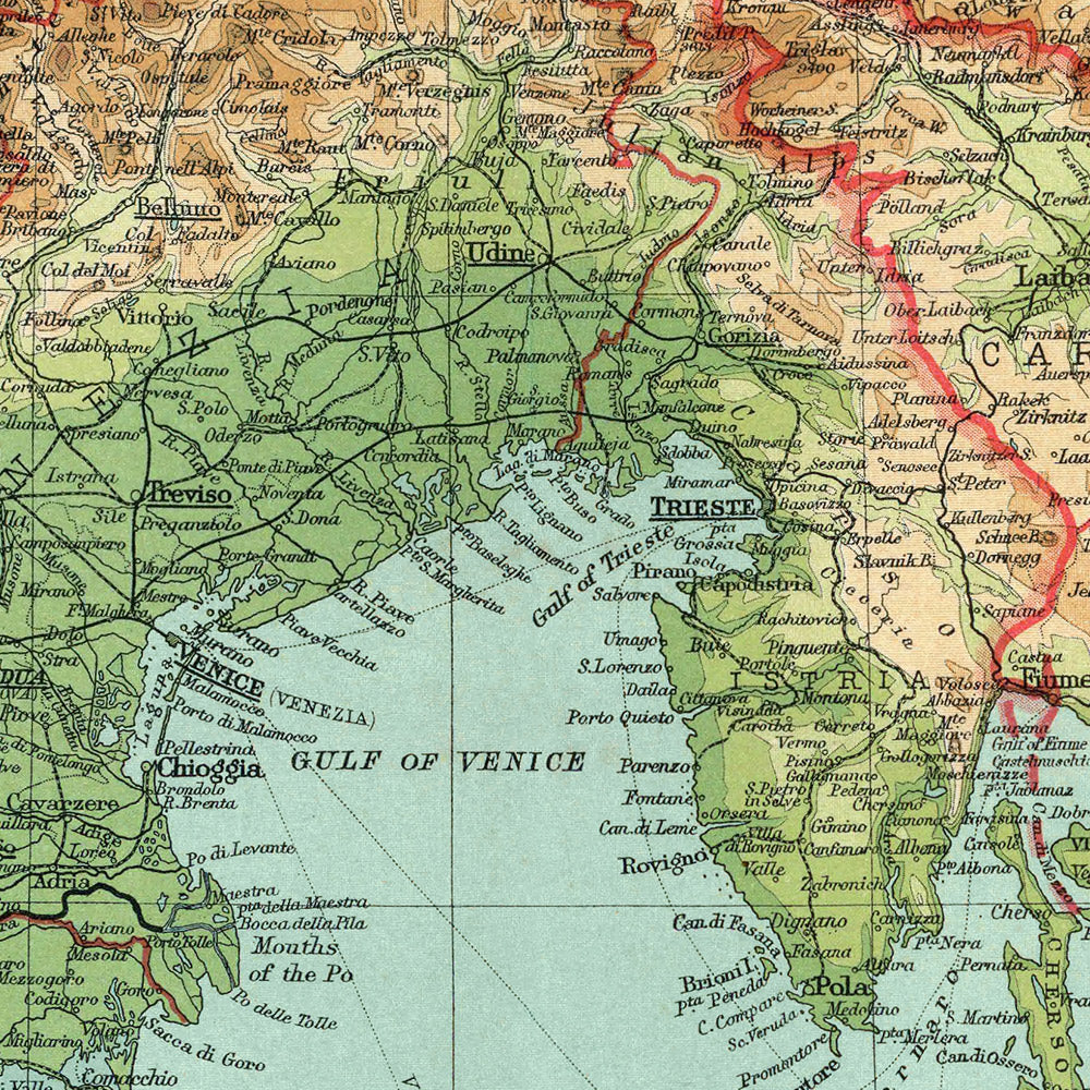 The map’s authority derives from Bartholomew’s mastery of layered color and typographic hierarchy. Hypsometric tints graduate from the deep greens of the Po plain to the ochres and russets of the Alpine wall, while shadowed slopes and spot heights give the Dolomites, Carnic, and Julian Alps a tactile presence. Bathymetric washes step the depth of the Adriatic and alpine lakes, harmonizing land and sea in a single chromatic system. Major rivers are drawn with lucid continuity, their widths and labels scaled to importance, and mountain names climb along the ridges they denote. The legend and scales provide a disciplined key to this orchestration, transforming complex terrain into a legible, navigable whole.