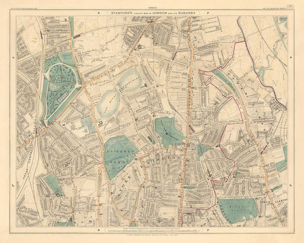El mapa se publicó originalmente en 24 hojas. En total, el mapa habría medido aproximadamente 2 metros de ancho (78 pulgadas). Este aquí es la hoja 3, que se centra en Stoke Newington, Hackney Downs, Finsbury Park y otras áreas cercanas.