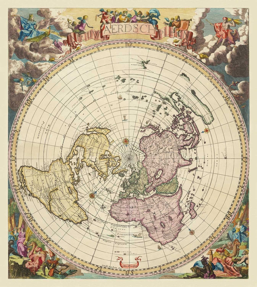 Un mapa mundial "plano de la Tierra" altamente atractivo y extremadamente raro, publicado originalmente por Jacob Harrewyn en 1696. Hermosas grabados adornan las cuatro esquinas del mapa.