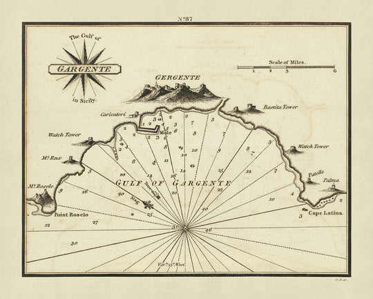 "El Golfo de Gargente en Sicilia" ocupa un lugar de distinción ya que proviene de El Nuevo Piloto Mediterráneo, que marcó una significativa contribución británica a los mapas náuticos del Mediterráneo. La rareza de los mapas de Heather, especialmente esta representación detallada del Golfo de Agrigento, lo convierte en un artículo codiciado por coleccionistas e historiadores por igual. Cada mapa de esta serie es un artefacto raro, capturando un momento en la historia náutica donde las técnicas de cartografía inglesas comenzaron a dejar su huella en la navegación mediterránea.
