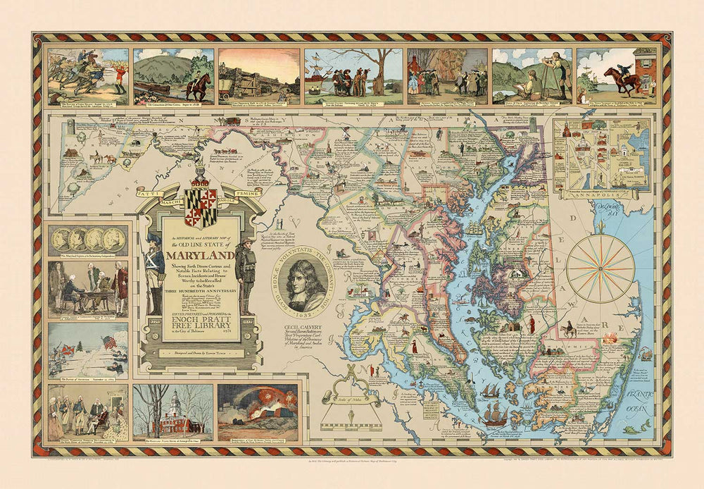 Impreso en el 300 aniversario del estado, este mapa histórico del Old Line State ilustra la vasta historia de ese estado, incluyendo sus hechos notables, escenas, personas e incidentes.
