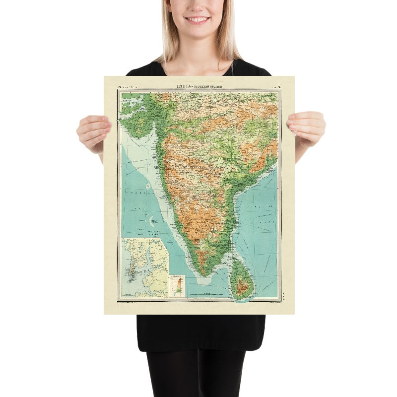 Rare Old Hypsometric Map of Southern India by Bartholomew, 1922: Mumbai, Chennai, Hyderabad, Western Ghats, Deccan