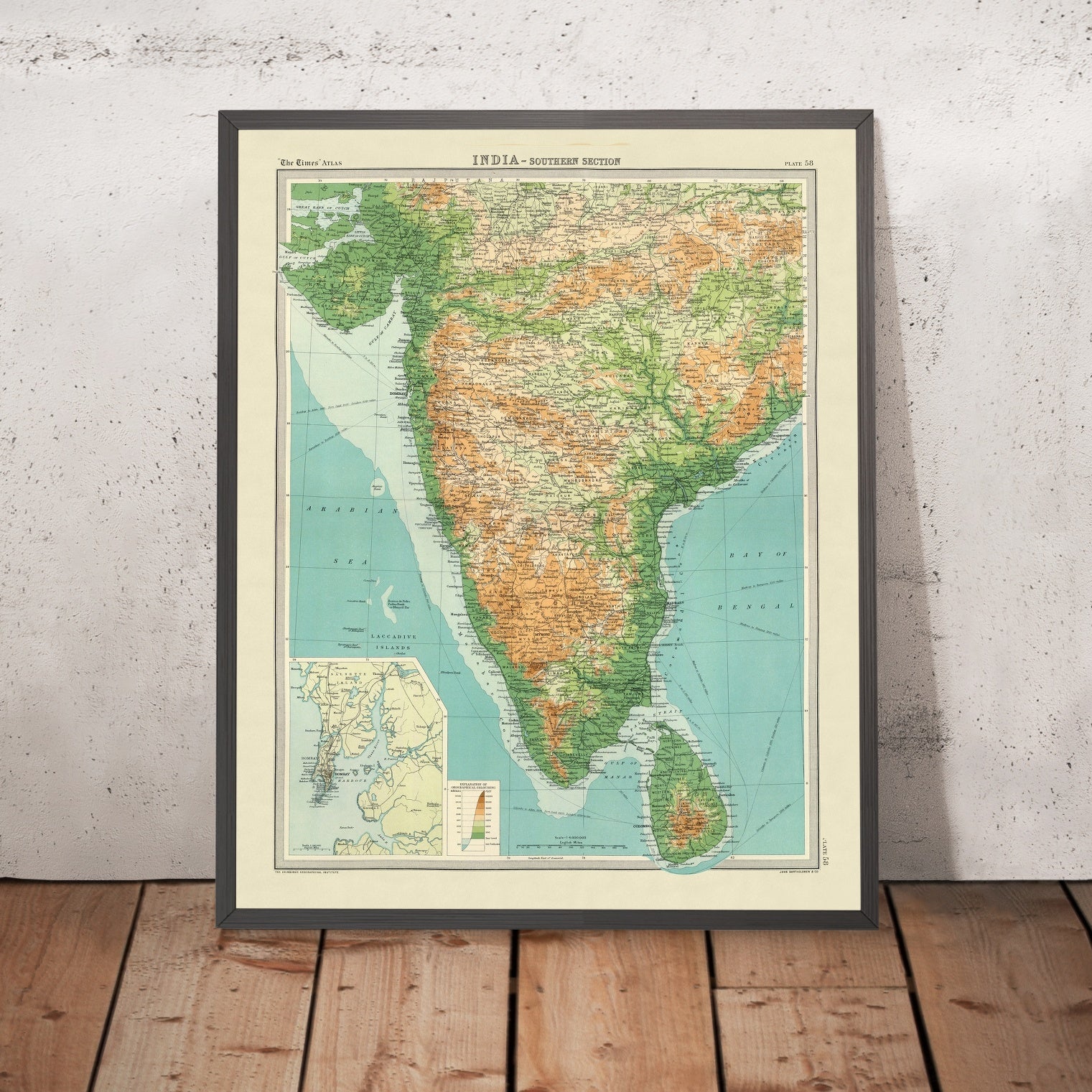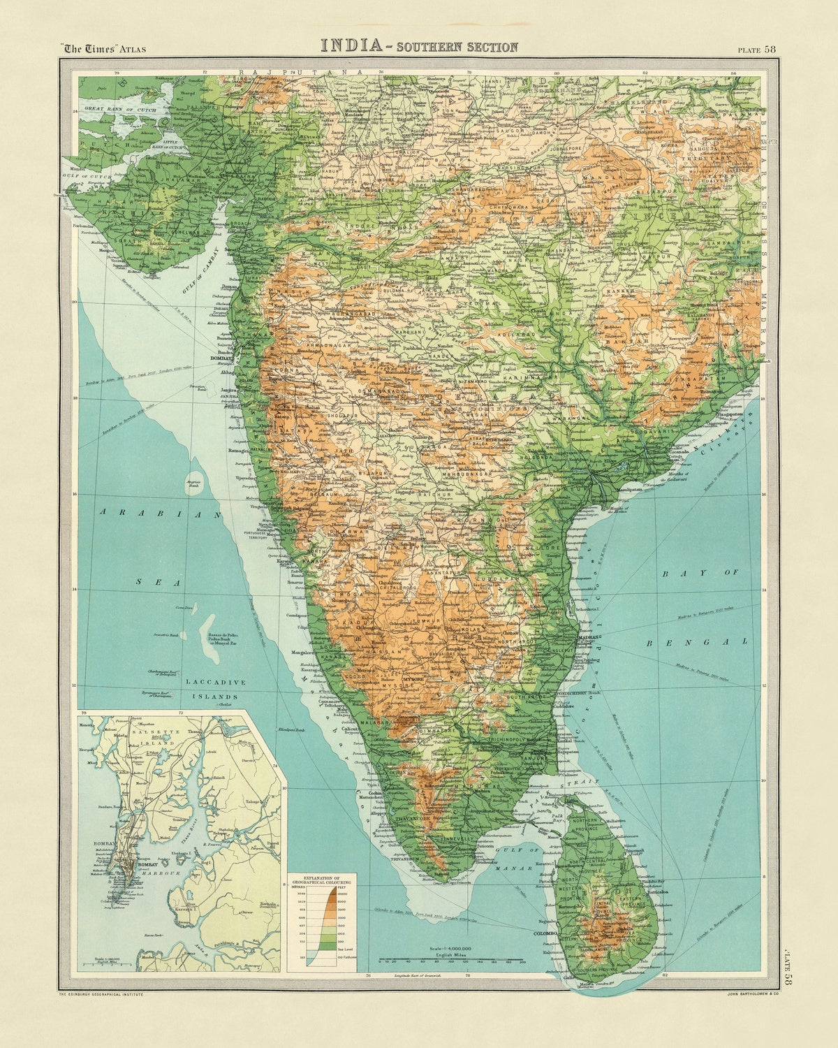 India - Southern Section is a masterful snapshot of a subcontinent in transition, rendered in 1922 for The Times atlas by The Edinburgh Geographical Institute and John Bartholomew & Co. It gathers the southern sweep of the peninsula—Bombay’s western approaches through the Deccan plateau to the Coromandel and Malabar coasts—into a lucid synthesis of politics and terrain. Hypsometric tints bathe the escarpments and plateaux in graduated color, while bathymetric shading deepens the surrounding seas, and spot heights lend a scientific precision to the relief. Shipping routes arc across the Arabian Sea and Bay of Bengal, annotated with distances that tether inland cities to far-flung ports, conveying the commercial geography that shaped early twentieth-century India.