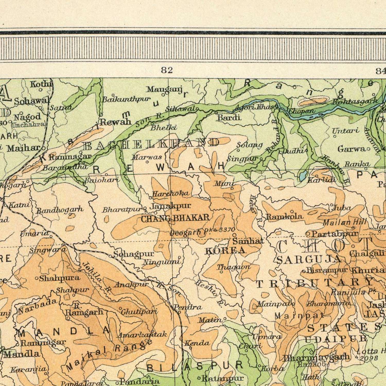 - Hypsometric tints illustrating varying elevations.