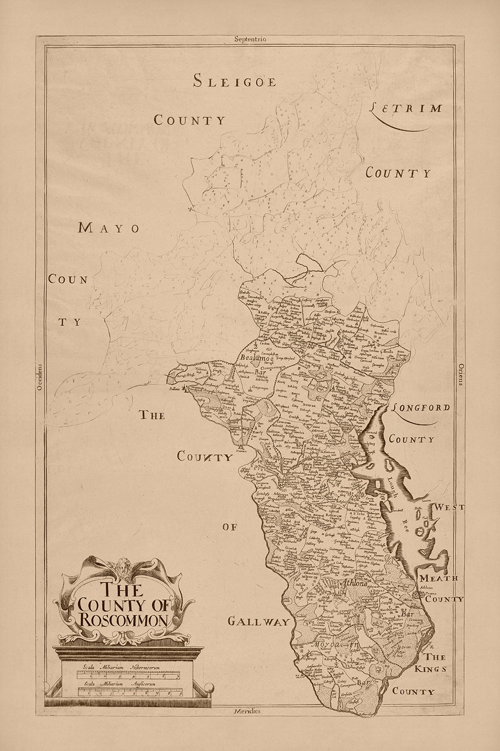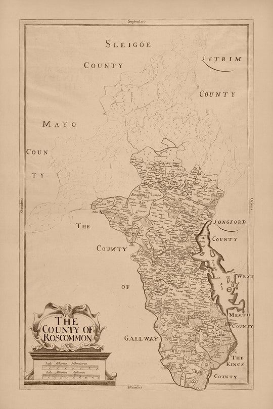 Este mapa del Condado de Roscommon, publicado originalmente en 1685 por Sir William Petty, es un mapa político y físico detallado que proporciona una gran cantidad de información sobre el condado a finales del siglo XVII. El mapa se basa en el Down Survey de Irlanda, la primera encuesta de tierras detallada a escala nacional en cualquier parte del mundo, que se llevó a cabo de 1656 a 1658. El mapa de Petty es una versión a escala reducida del Down Survey, pero aún así logra capturar una impresionante cantidad de detalles.