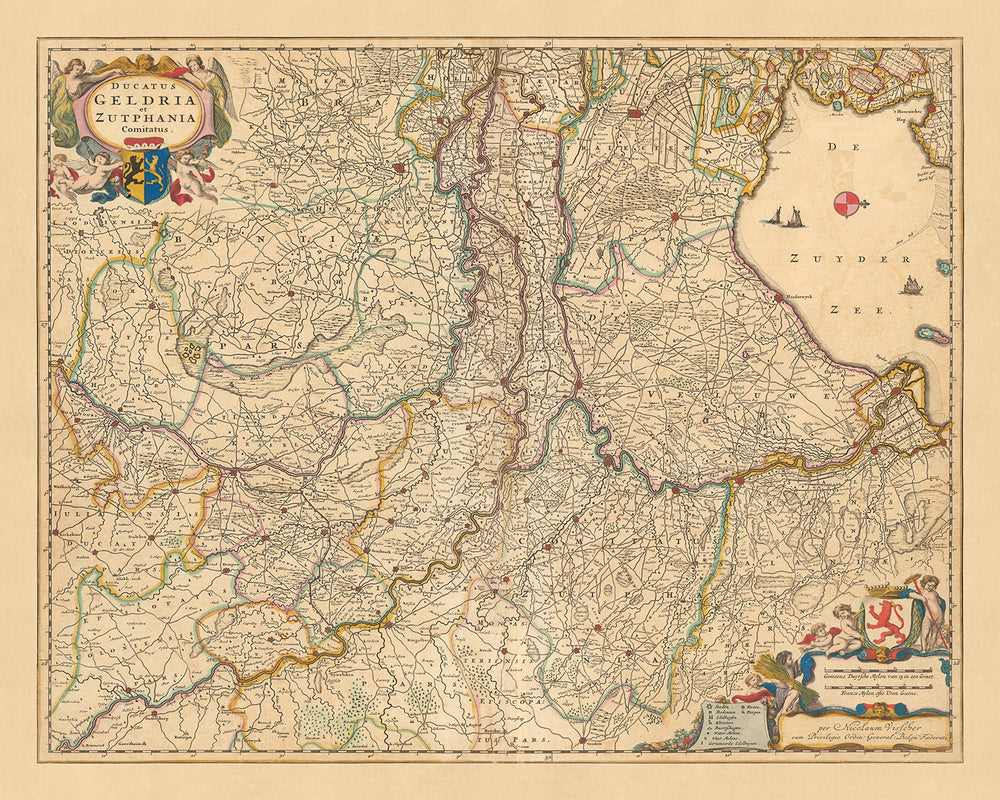 Mapa antiguo del Ducado de Guelders y Zutphen por Visscher, 1690: Amsterdam, Amersfoort, Utrecht, Eindhoven, Nijmegen