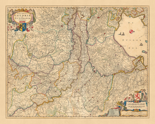 Eindhoven y Nijmegen, otras dos ciudades que aparecen en el mapa, ofrecen más información sobre la historia de la región. Eindhoven, ahora conocida como un centro global de tecnología y diseño, se representa como una pequeña ciudad fortificada, mientras que Nijmegen, una de las ciudades más antiguas de los Países Bajos, se representa con sus emblemáticas murallas y el paisaje rural circundante. Este mapa, centrado en el Ducado de Guelders y Zutphen, ofrece un cautivador viaje histórico a través de estas regiones, lo que lo convierte en una herramienta imprescindible para cualquier coleccionista o entusiasta de la historia.