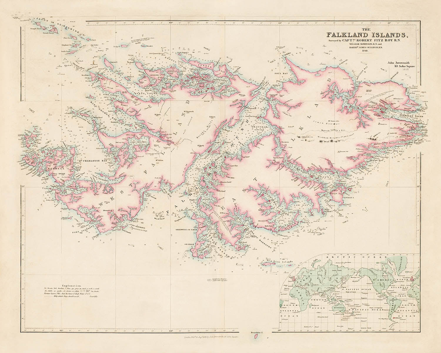 El trabajo de Arrowsmith no es solo una representación geográfica; es una ventana al pasado, capturando la esencia de las Islas Malvinas durante un período de exploración y descubrimiento. El mapa detalla intrincadamente la topografía de las islas, con un enfoque en características naturales que habrían sido cruciales para la navegación y el asentamiento. Esta atención a los fenómenos naturales y la precisión geográfica subraya el valor del mapa como un artefacto tanto artístico como histórico.