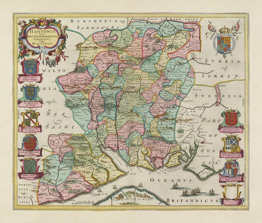 Este es un mapa antiguo de color completo de Hampshire, extremadamente raro, creado por el maestro cartógrafo Joan Blaeu desde su taller en Ámsterdam y publicado originalmente en este Theatrum Orbis Terrarum Sive Atlas Novus en 1665.