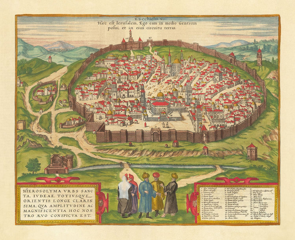 Publicado en 1582 por Georg Braun y Frans Hogenberg, este es el mapa completo y verdadero más antiguo de Jerusalén. Si Shakespeare alguna vez visitó Jerusalén, así es como habría lucido. Este mapa fue publicado por primera vez en Civitates Orbis Terrarum - las Ciudades del Mundo - que era una obra maestra cartográfica con 546 mapas.
