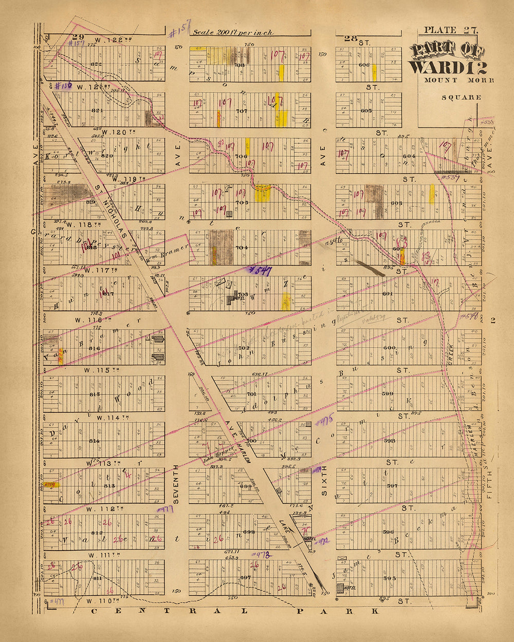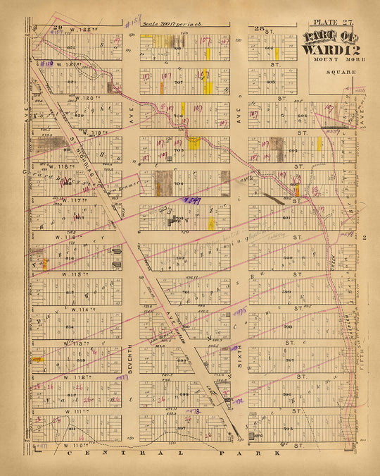 El mapa no es solo una representación de calles y bloques; es un documento histórico que revela el diseño y los patrones de desarrollo de la Ciudad de Nueva York durante una era crucial. Cada calle, desde la 110 hasta la 128, y avenidas como Lenox, St. Nicholas y la 7, están meticulosamente trazadas, mostrando la expansión metódica de la ciudad. La inclusión de vías significativas como la 5ta Avenida y la 6ta Avenida destaca la importancia de estas rutas en la red de transporte de la ciudad, que facilitó el comercio y la vida diaria.