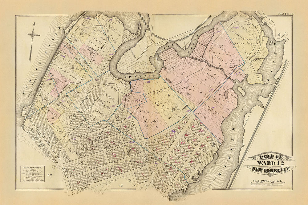 Este mapa es particularmente notable por su representación de los barrios y lugares de interés importantes dentro del Distrito 12. El arroyo Spuyten Duyvil, una importante vía fluvial, está elegantemente ilustrado, reflejando la geografía natural que influyó en la expansión de la ciudad. El río Harlem, otra característica clave, se muestra de manera destacada, enfatizando su importancia como ruta de transporte y comercio durante finales del siglo XIX. Estas vías fluviales, combinadas con las cuadrículas de calles detalladas, brindan una comprensión integral del diseño del área y su importancia estratégica.