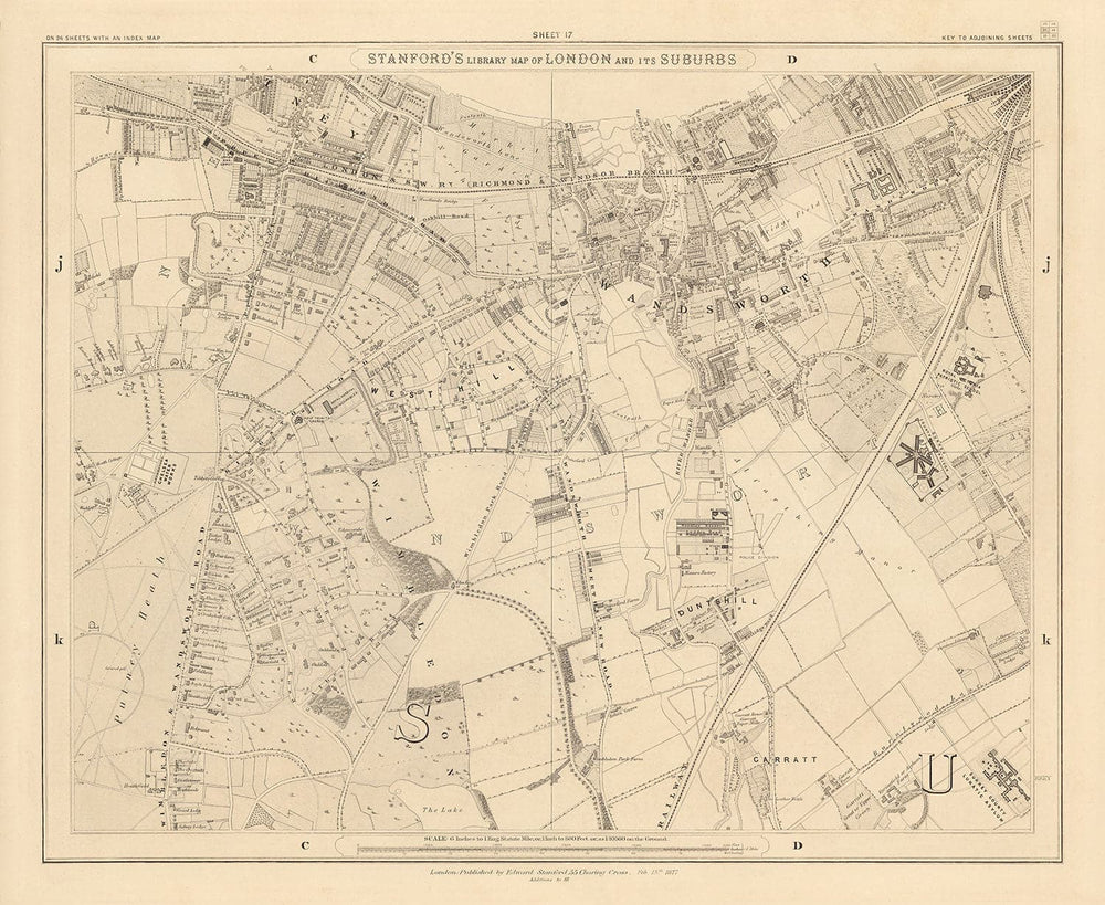 El mapa fue publicado originalmente en 24 hojas. En total, el mapa habría medido aproximadamente 2 metros de ancho (78 pulgadas). Esta aquí es la hoja 17, que se centra en el distrito de Wandsworth en el sur de Londres. Putney, Putney Heath, Wimbledon, el río Wandle y otras encantadoras partes de esta área son claramente visibles.