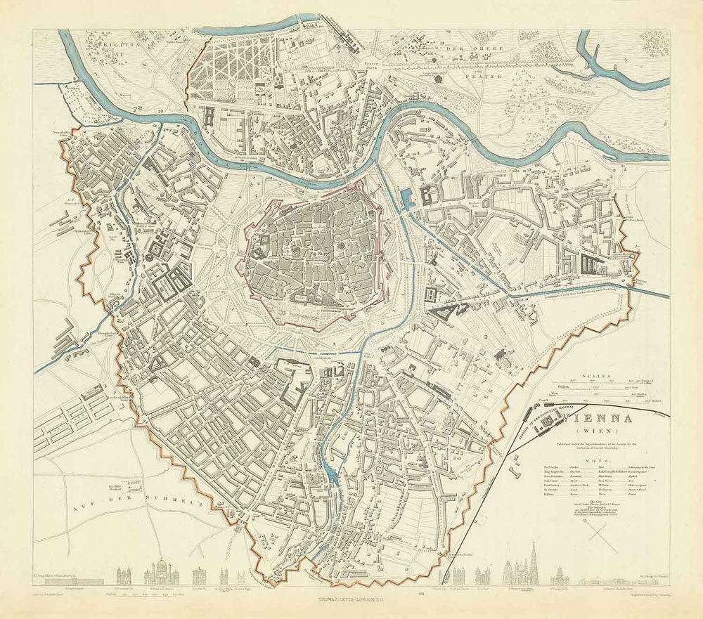 Mapa antiguo de Viena por SDUK en 1887: Río Danubio, Alte Donau, Graben, Rennweg, Iglesia de San Carlos