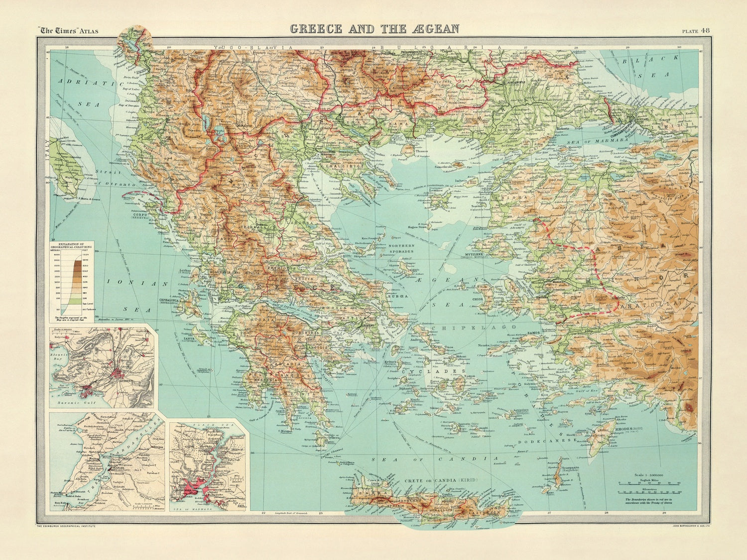 Rare Old Topographic Map of Greece & the Aegean Sea by Bartholomew, 1922: Athens, Thessaloniki, Crete, Dardanelles, Bosporus