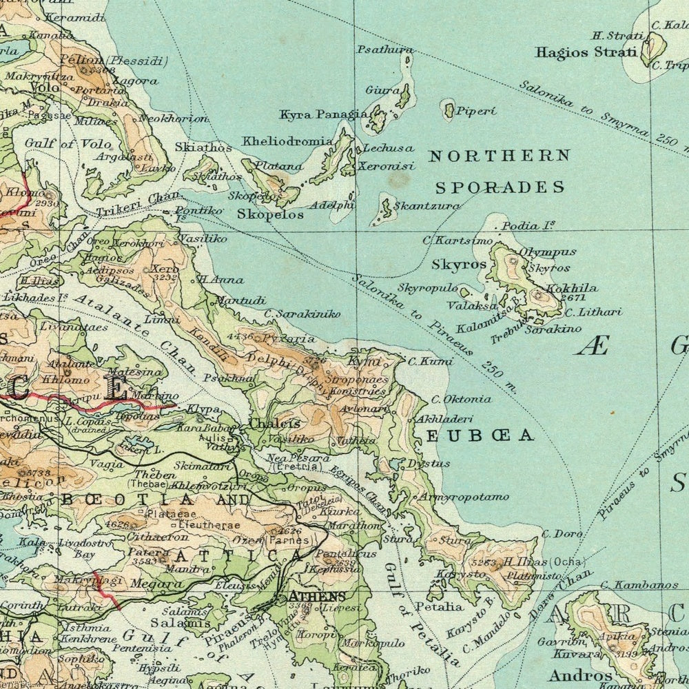 The sea receives equal authority. Bathymetric tints articulate shelves and deeps, from the Cycladic plateau to the darker soundings that rim the southern Aegean and the approaches to Crete. Clearly marked shipping routes sweep out from Piraeus and thread among the Cyclades and Sporades, arc to Chios and Izmir (Smyrna), and converge on the great straits that lead to the Sea of Marmara and beyond. These plotted lanes suggest prevailing pathways for commerce and passage, illuminating how wind, water, and safe channels dictate the cadence of maritime life. The Aegean’s complexity—its capes, sounds, and lee-side havens—reads here as both navigational guide and distilled maritime history.
