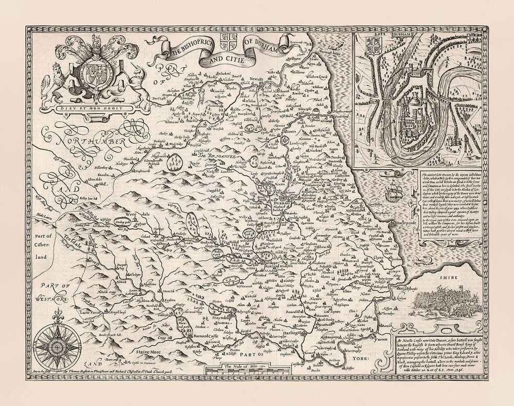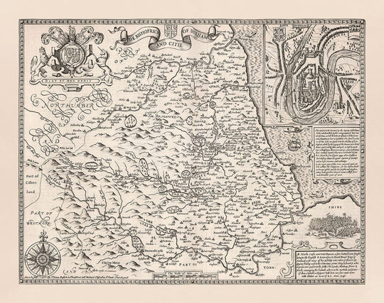 En la parte superior derecha hay un grabado detallado de la ciudad de Durham. Sunderland también es visible en este mapa, antes de convertirse en parte de Tyne y Wear.