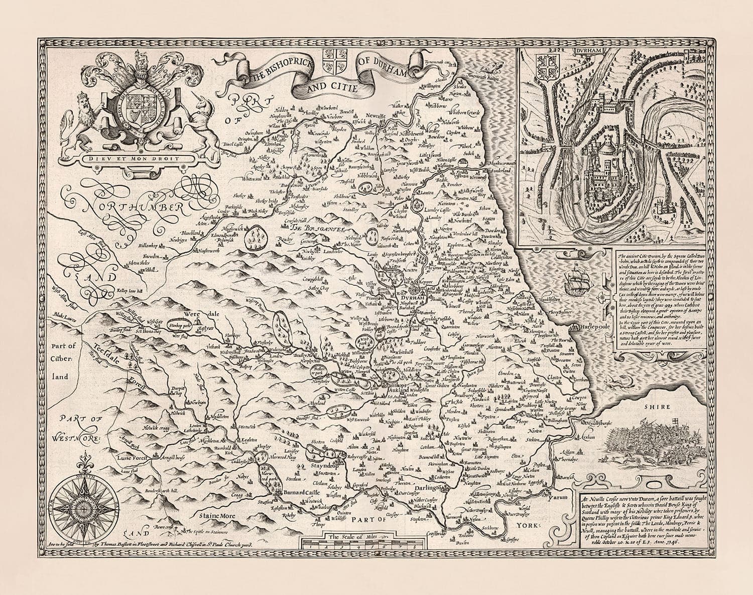 Muchos de los pueblos, aldeas y ciudades en el obispado de Durham ya son visibles en este mapa.