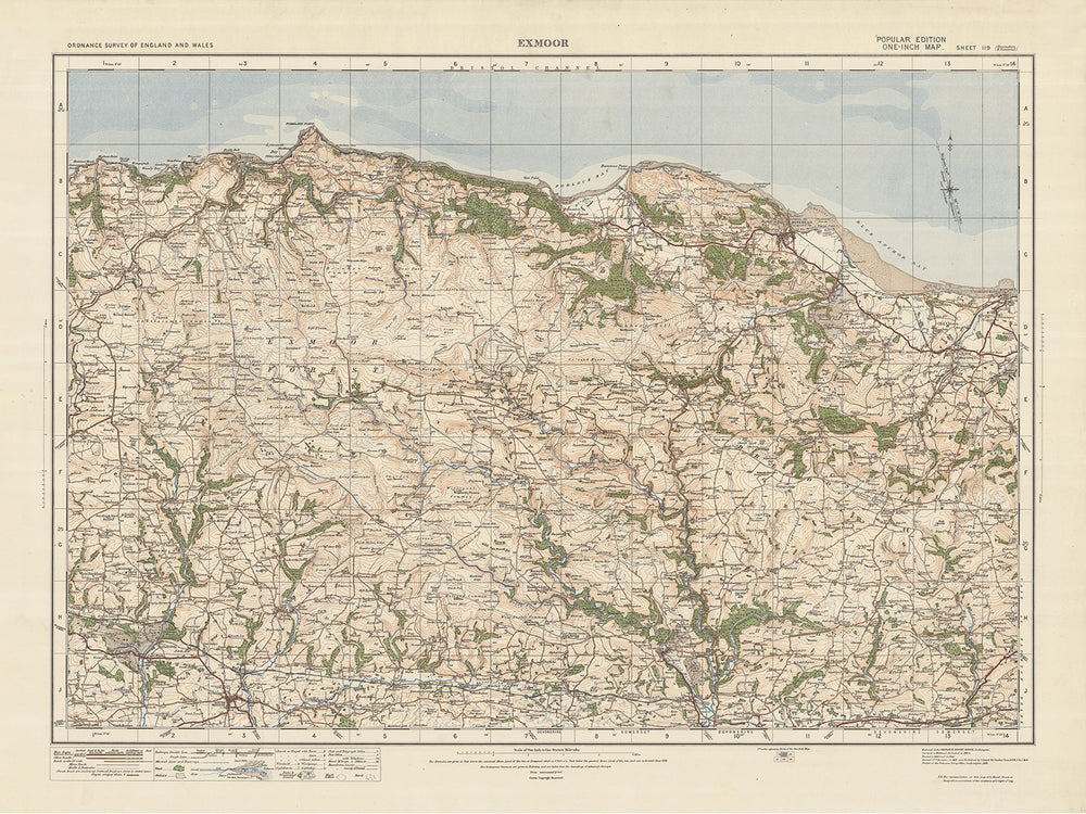 Este mapa antiguo titulado "Hoja 119 - Exmoor" de la edición "Popular" de una pulgada de Ordnance Survey, Inglaterra y Gales, publicada en 1925, ofrece una visión fascinante del pasado. El mapa muestra el condado histórico de Exmoor, conocido por sus impresionantes paisajes y su rico patrimonio cultural. El título del producto destaca los principales pueblos, ciudades y características interesantes del mapa, excluyendo Exmoor, proporcionando una descripción general concisa del contenido del mapa.