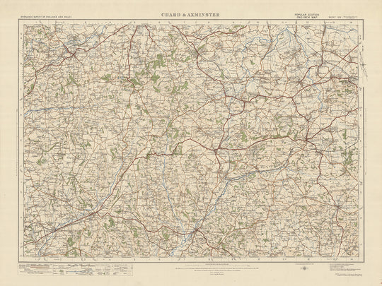 La "Hoja 129 - Chard & Axminster" es un mapa antiguo auténtico y fascinante de la edición "Popular" de una pulgada de Ordnance Survey, Inglaterra y Gales, publicada en 1925. Este mapa meticulosamente detallado muestra las ciudades de Chard y Axminster, junto con varias otros asentamientos y características destacables. Proporciona una visión cautivadora del pasado, permitiéndole explorar el paisaje, las carreteras y los lugares emblemáticos de esta región histórica.