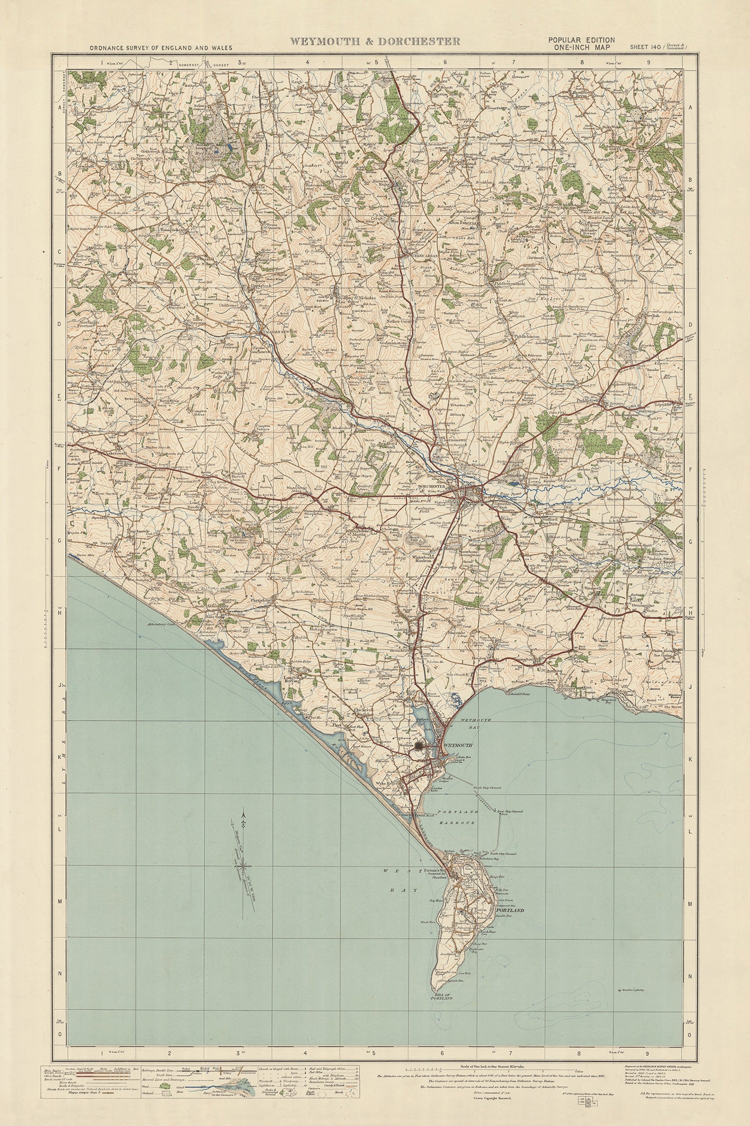 Mapa de Old Ordnance Survey, hoja 140: Weymouth y Dorchester, 1925: Cerne Abbas, Puddletown, Abbotsbury, Isla de Portland, Dorset AONB