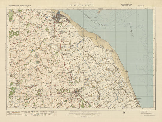 Este mapa antiguo meticulosamente conservado, titulado "Hoja 40 - Grimsby & Louth", es una pieza notable de la edición "Popular" de una pulgada de Ordnance Survey, Inglaterra y Gales, publicada en 1925. El mapa muestra el condado histórico de Lincolnshire, destacando específicamente las ciudades de Grimsby y Louth, junto con varios otros lugares fascinantes. Tenga en cuenta que, si bien es posible que algunas ciudades modernas no estén representadas en este mapa, ofrece una visión intrigante del pasado, donde algunos asentamientos pueden aparecer con nombres anteriores.