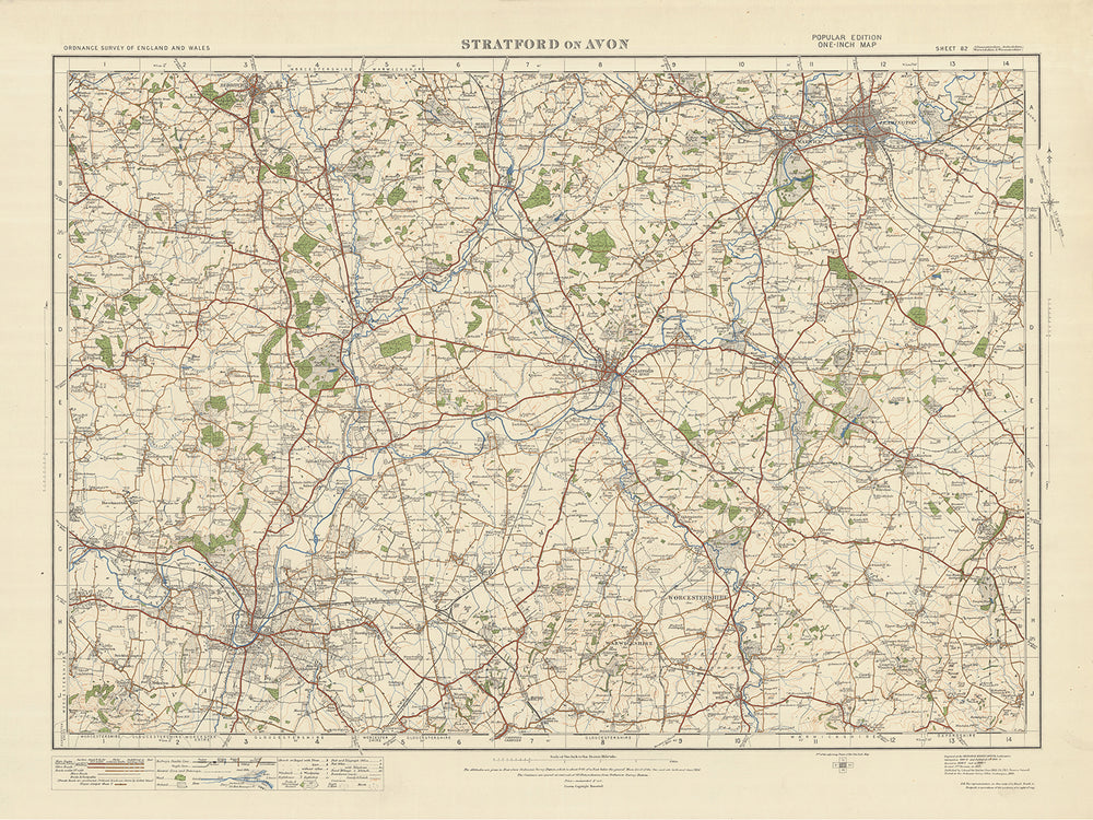 El mapa "Hoja 82 - Stratford on Avon" de la edición "Popular" de una pulgada de Ordnance Survey, Inglaterra y Gales, publicada en 1925, ofrece una visión fascinante del pasado con su descripción detallada del histórico condado de Warwickshire. Este mapa meticulosamente elaborado muestra no solo la famosa ciudad de Stratford on Avon, sino también otros pueblos, ciudades y lugares interesantes de la época. Si bien es posible que algunas ciudades modernas no estén incluidas, este mapa brinda una oportunidad única de explorar la región tal como era hace casi un siglo, descubriendo gemas ocultas y descubriendo lugares con nombres anteriores.
