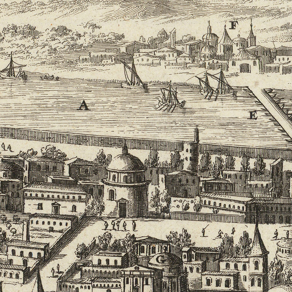 As a city map, this view is notable for the rare confluence of urban morphology, imperial context, and environmental setting it captures in a single glance. Few early-eighteenth-century images render Baghdad with such narrative density: walls holding a storied core, the Tigris channeling lifeblood, fields and hills delineating a sustaining countryside, and a ceremonial foreground proclaiming rank and route. It is a document to be read in layers—trace the river’s course, identify the lettered monuments, follow the implied paths from gates to markets, and you reconstruct the city’s economic ecosystem. For historians, it illuminates a transitional moment; for connoisseurs, it offers a masterclass in pictorial cartography, where every engraved figure helps explain why Baghdad mattered—and how it worked.