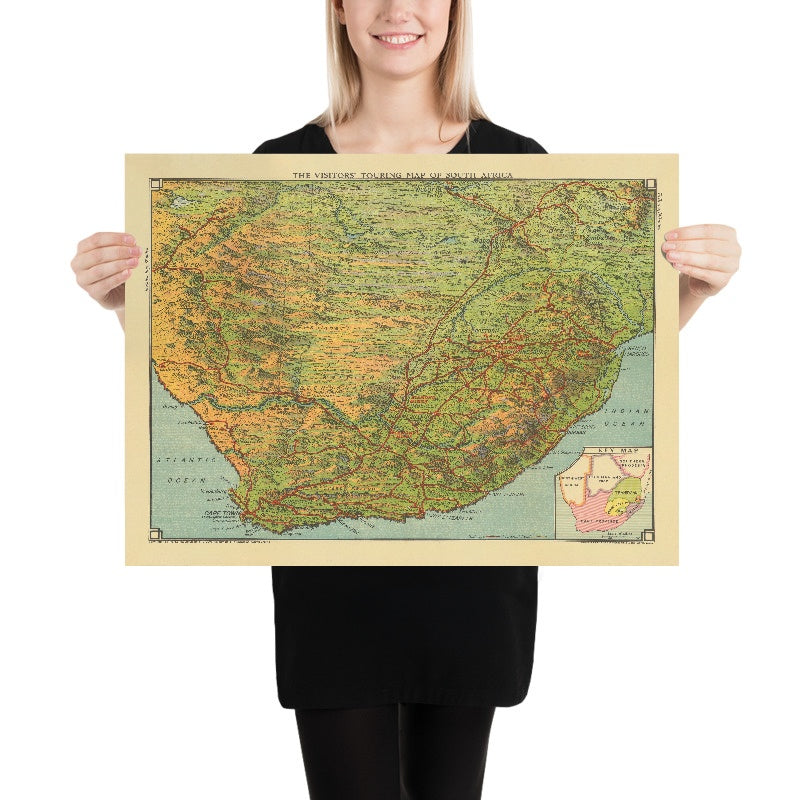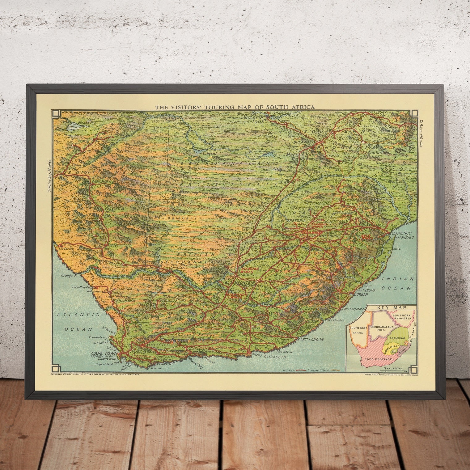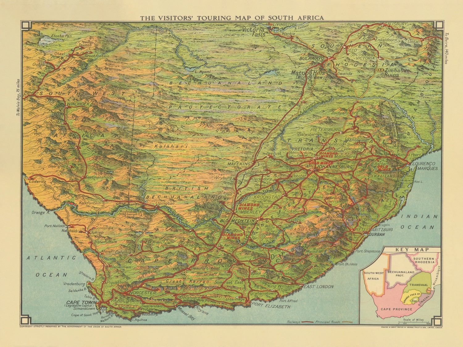 The Visitors' Touring Map of South Africa, issued in 1930 by George Philip & Son in collaboration with the Union of South Africa, unfolds the country in a luminous bird’s-eye panorama designed to kindle wanderlust. In the warm, slightly muted palette reminiscent of Fred Routledge’s celebrated airplane maps, coastlines, mountain chains, and river courses are drawn with theatrical sweep, while the Atlantic and Indian Oceans bracket the scene like stage curtains. Major routes stride confidently across the land, guiding the eye from port to plateau, from vineyards to veld. It is at once an enticement and an orientation—an artful promise that modern transport, abundant sunshine, and storied landscapes converge in a single, navigable vision.