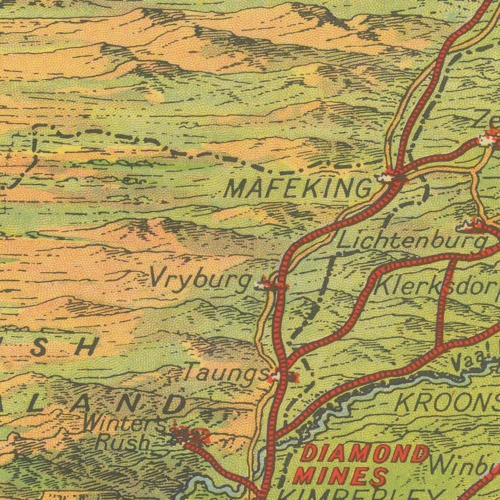 Tourism, mining, and mobility are the map’s three-part refrain. The great goldfields of the Witwatersrand are spotlighted around Johannesburg, their significance to modern South African identity conveyed through emphatic labels and strategic placement. Kimberley’s diamond mines gleam as cultural touchstones of enterprise and legend. Yet the cartographer does more than catalog resource wealth: by threading rail lines and motor routes past mines, mountain passes, and rivers, the design recasts industry as itinerary. Travelers are invited to pair the spectacle of engineering with the scenery of nature—steel ribbons traversing open veld, coach roads skirting escarpments—an itinerary of contrasts that promised both comfort and adventure.