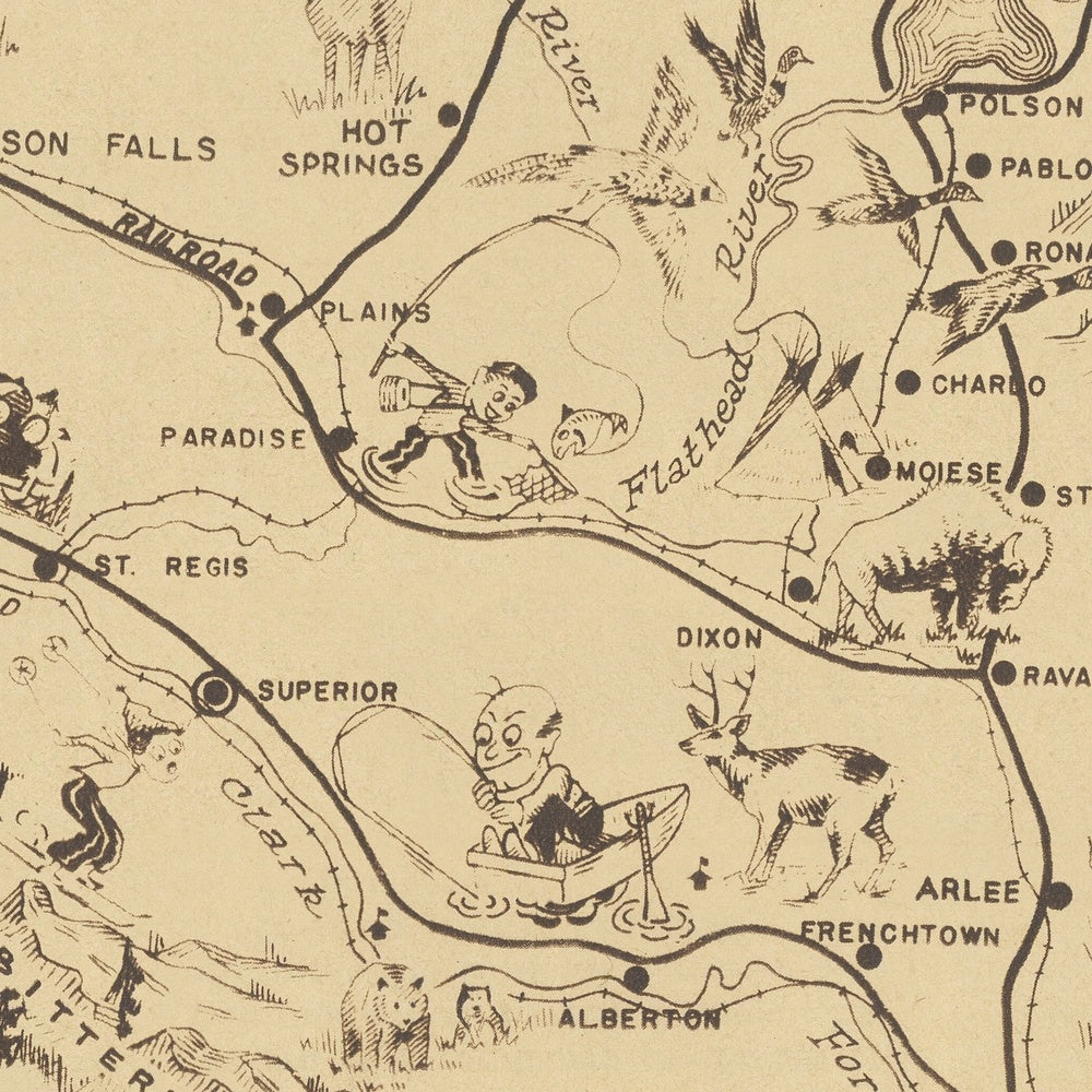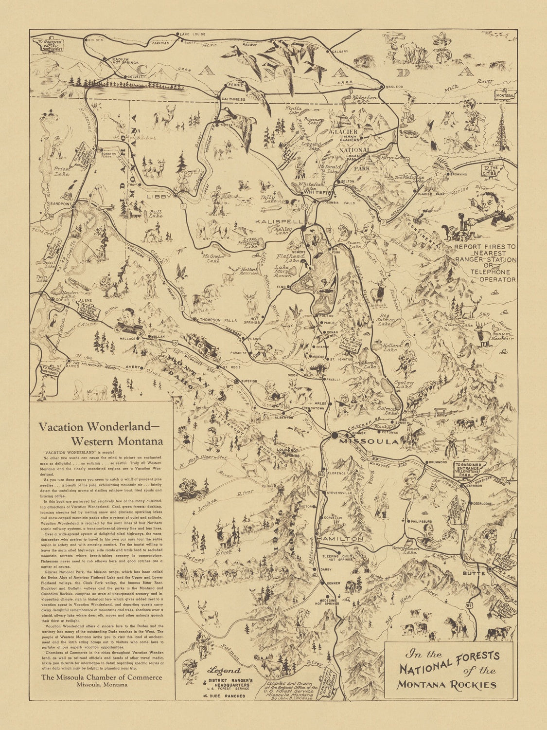 Historically, the map reflects a pivotal promotional push that made Montana a national vacation destination in the early twentieth century. Its fire-reporting advisories echo the conservation priorities of the interwar years, when forest management and public education were braided into recreation outreach. The emphasis on roads and automobile access speaks to an era of expanding forest highways and roadside amenities, as communities positioned themselves along scenic corridors. At the same time, the inclusion of dude ranches and ranger stations documents the social architecture of the western holiday—part hospitality, part stewardship—while the cheerful illustrations soften the gravity of wilderness safety into memorable public service. It is a cultural artifact of tourism, conservation, and civic boosterism working in concert.