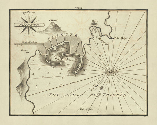 Como parte de "El Nuevo Piloto Mediterráneo", este mapa de Trieste se destaca por su rareza y el contexto de su creación. La serie fue uno de los primeros intentos ingleses de catalogar los puertos del Mediterráneo, un género previamente dominado por cartógrafos franceses, italianos y españoles. Las versiones en inglés, particularmente la de Heather, fueron reconocidas por su calidad de grabado superior, lo que las hizo muy buscadas por coleccionistas e historiadores por igual. Poseer este mapa es como poseer un artefacto raro que ofrece tanto una narrativa histórica como un testimonio de la maestría cartográfica de principios del siglo XIX.
