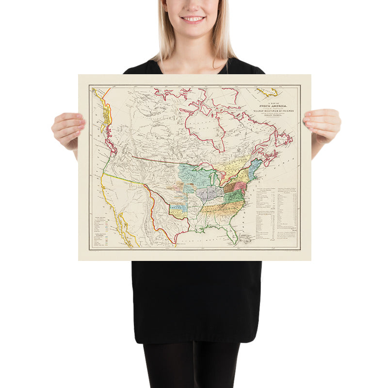 - Yearly Meeting Boundaries: Differentiated by color-coded lines, outlining the various regional Quaker meetings.